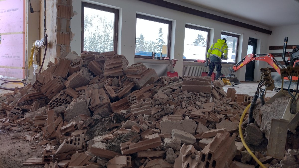 Eine der letzten Abbrucharbeiten war der Zugang zum künftigen Eingangsraum mit Kasse und Shop. Die Räumlichkeiten befinden sich im ehemaligen Imbiss und wurden zuletzt als Einrichtung der Infostation für die Besucherinnen und Besucher genutzt. Auch künftig dient dieser Raum als erste Anlaufstelle für den Besuch der Klamm-Erlebniswelten. Im Raum selbst werden zusätzlich noch Säulen gestellt, um die darüberliegende Terrasse statisch zu unterstützen.