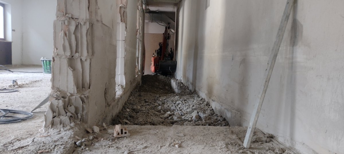 Nachdem im Frühjahr die Obergeschosse entkernt wurden folgte nun das Kellergeschoss. Mit Hilfe eines Elektrobaggers wurden hier sowohl Zwischenwände entnommen als auch die Punktfundamente für die statisch notwendigen Träger freigelegt. Die Räumlichkeiten für die Naturthemen wurden durch gezielte Wanddurchbrüche miteinander verbunden und gleichzeitig wurde mit der grundlegenden Errichtung der barrierefreien Rampe als Zugang zu den Ausstellungsflächen begonnen.